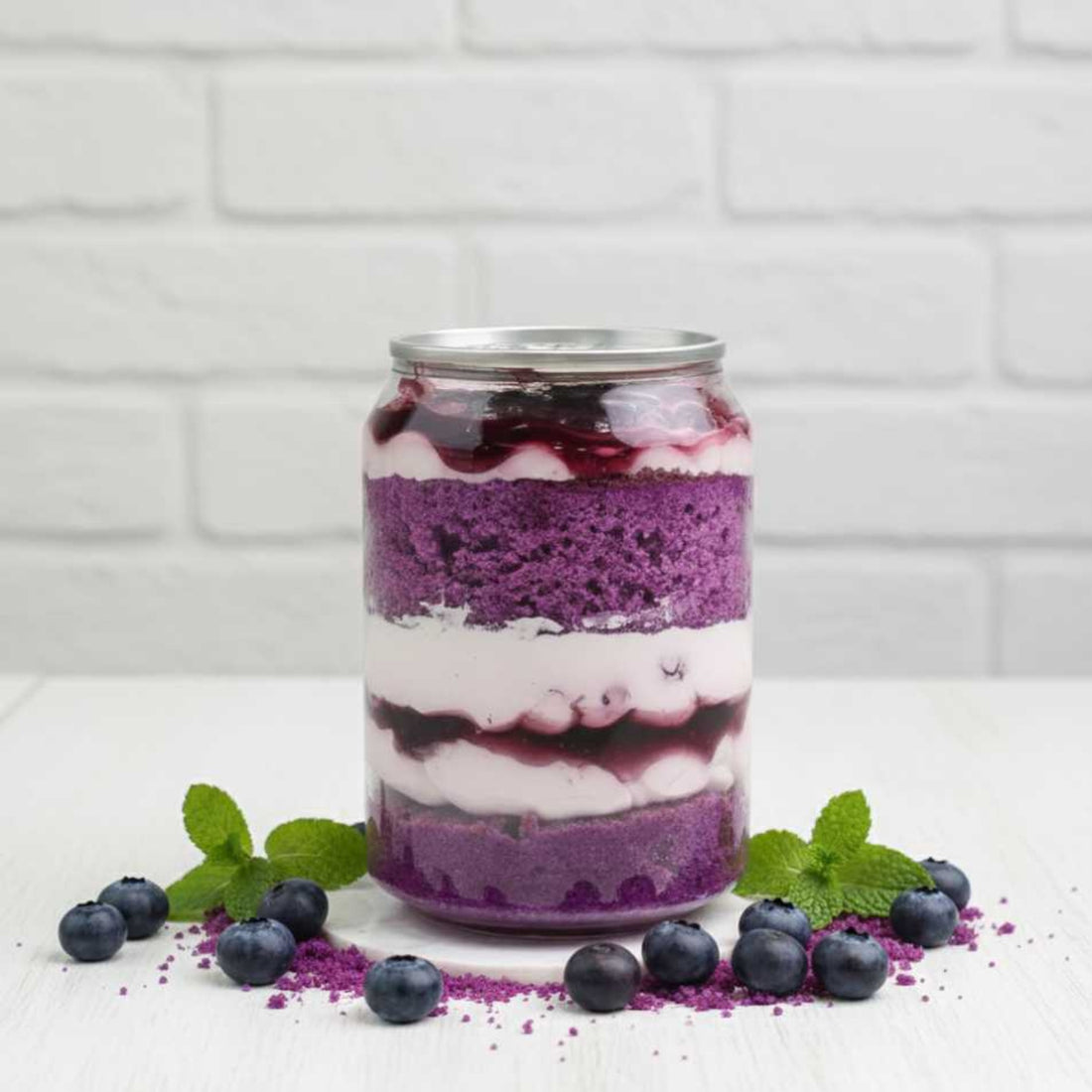 كعكة العلبة - التوت الأزرق حلوى فردية لذيذة معبأة في علبة عملية، تتكون من طبقات...