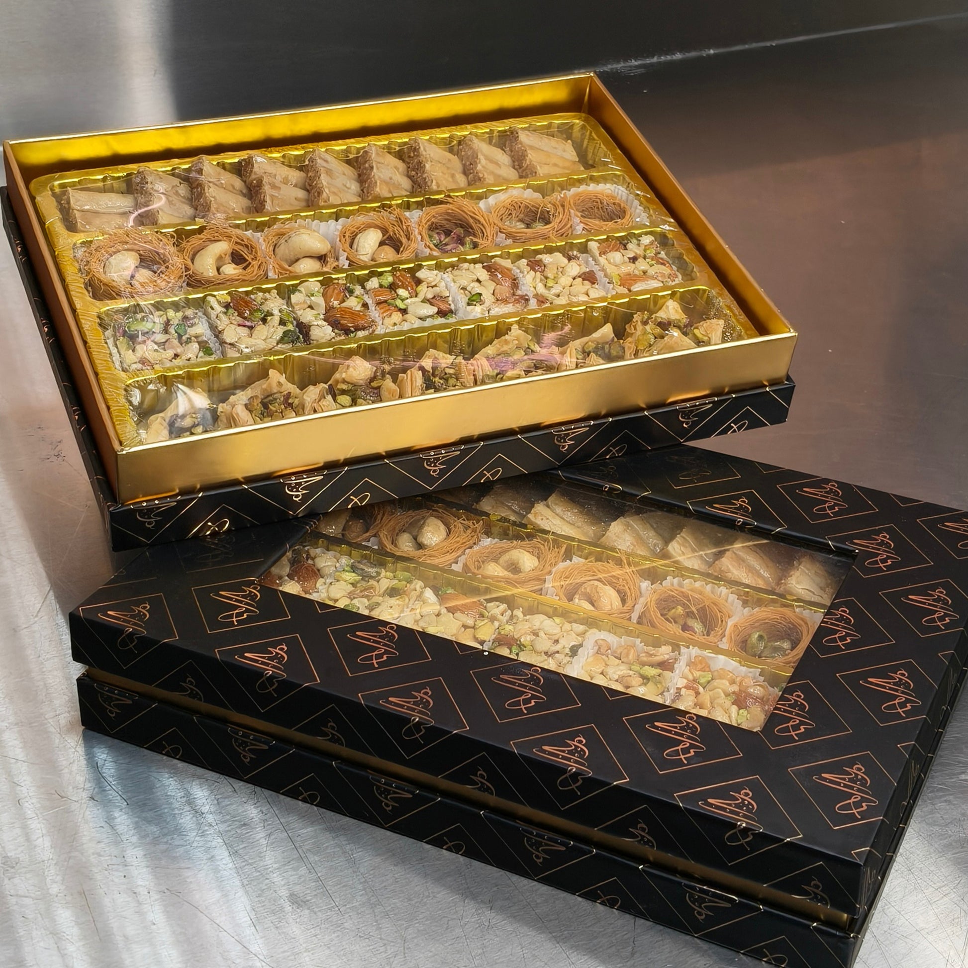 تُقدّم هذه المجموعة الأنيقة بوزن 500 غرام (±3%) في علبة سوداء فاخرة، مما يجعلها هدية مثالية أو إضافة راقية لأي مناسبة. يضم هذا التشكيل المختار بعناية تشكيلة متنوعة من الأشكال التقليدية ومزيج المكسرات، ليضمن تجربة تذوق ممتعة.