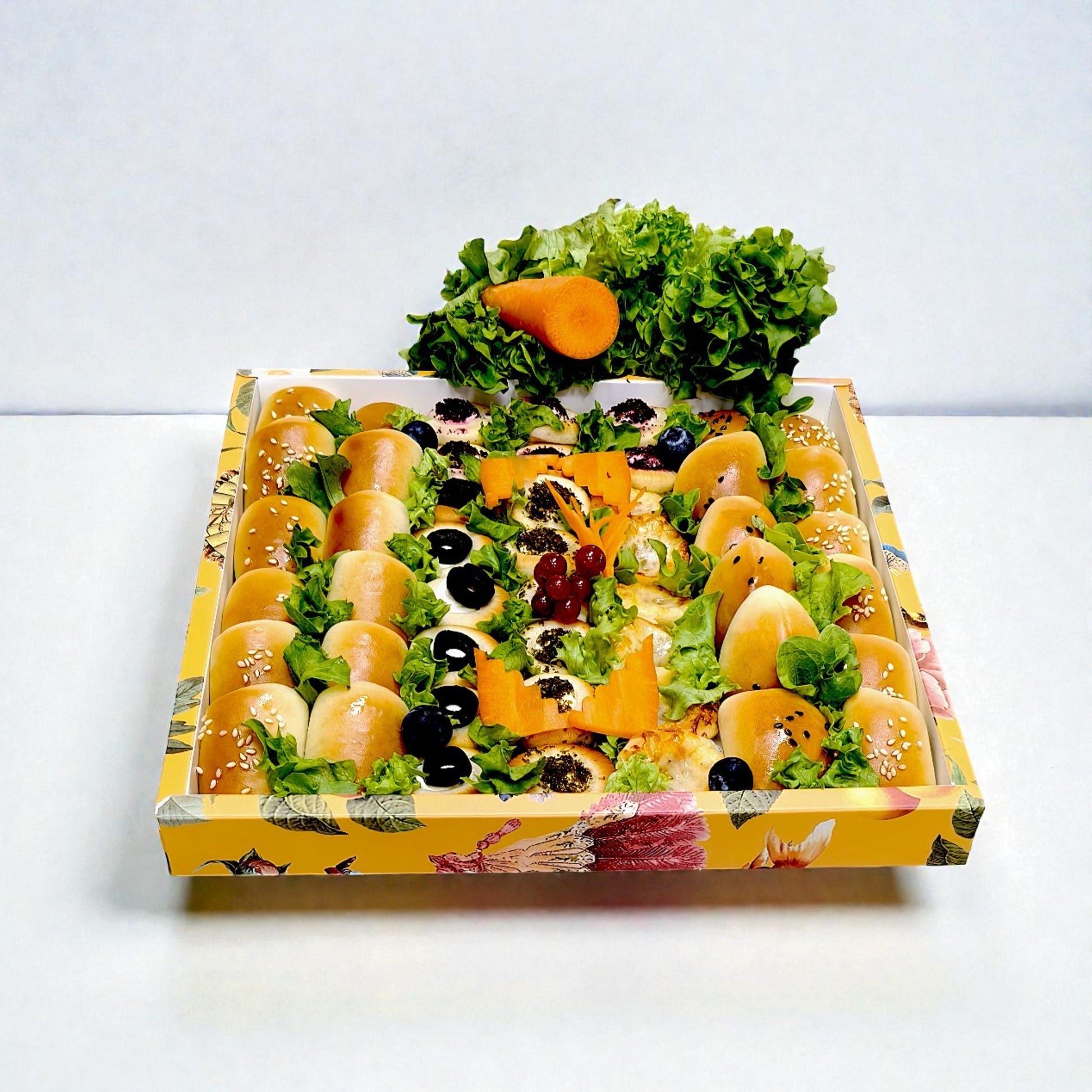 A generous platter of 45 bite-sized sandwiches and savory treats, perfect for parties, gatherings, or special occasions. This assorted mix includes: